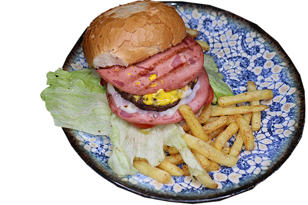 برگر،سس مخصوص،کاهو،گوجه،پنیر گودا،پنیر پارمسان،ژامبون دودی،خیار شور،سیب زمینی