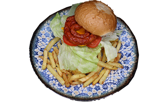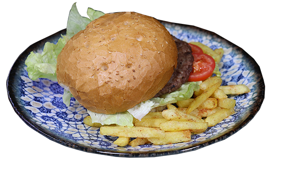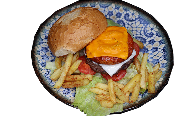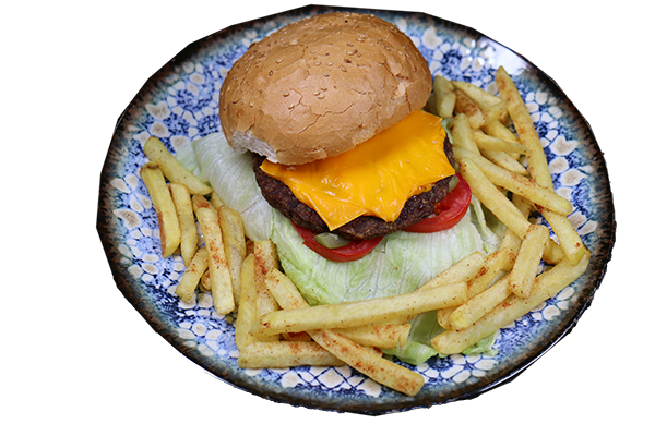 برگر،سس مخصوص،کاهو،گوجه،خیارشور،پنیر گودا،سیب زمینی